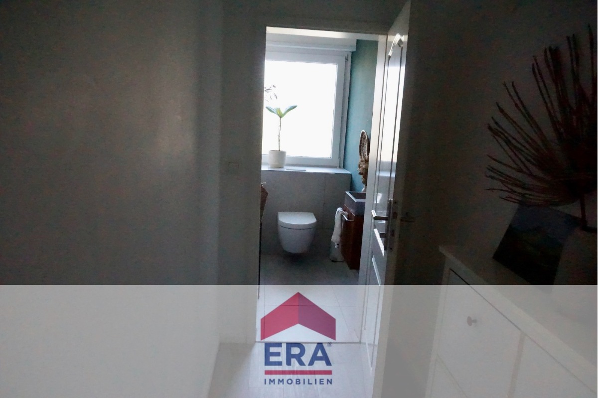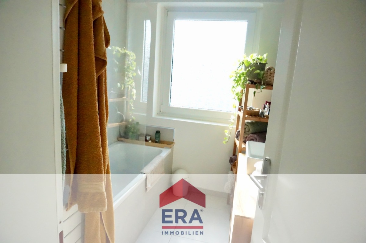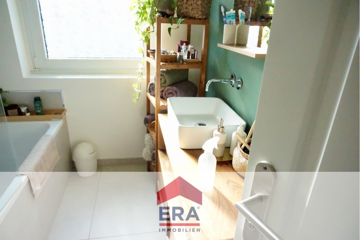 Zwischen den beiden Schlafzimmern befindet sich das moderne Tageslichtbad mit Badewanne und Waschbecken. Zur Wohnung gehören ein Kellerraum und eine Garage.